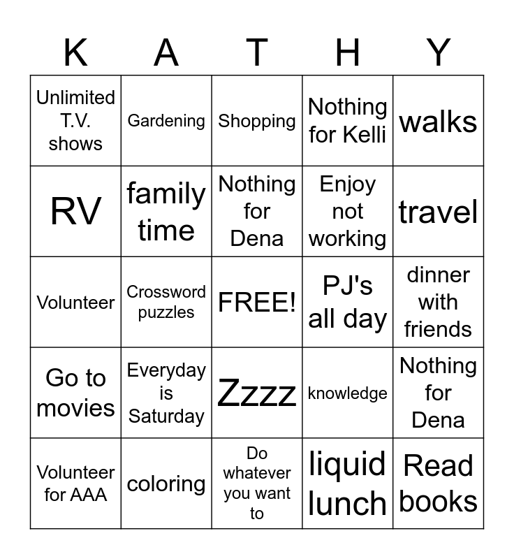 This bingo card has a free space and 30 words: coloring, Start a never-ending project, Crossword puzzles, Goodbye tension, Unlimited T.V. shows, Shopping, family time, Zzzz, PJ's all day, Do whatever you want to, dinner with friends, Read books, liquid lunch, Read magazine, travel, bring goodies to coworkers, knowledge, Go to movies, Everyday is Saturday, walks, Volunteer, Sleep in, Gardening, Enjoy not working, RV, Nothing for Kelli, Nothing for Dena, Volunteer for AAA, Nothing for Dena and Cook Lunch for AAA.