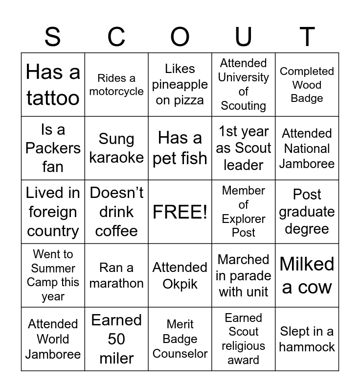 This bingo card has a free space and 49 words: Works from home, Slept in a hammock, Doesn’t use social media, Merit Badge Counselor, Ran a marathon, Has Recruiter strip, Rides a motorcycle, Awarded Silver Beaver, Is a Packers fan, Worn Viking Council patch, Sung karaoke, Attended University of Scouting, Milked a cow, Marched in parade with unit, Left handed, Red Cross certified, Has a pet fish, Member of Explorer Post, Drives a hybrid, Completed Wood Badge, Doesn’t drink coffee, Earned Scout religious award, Has a tattoo, 1st year as Scout leader, An Eagle Scout, Attended National Jamboree, Attended World Jamboree, Attended Philmont, Attended Okpik, Went to Summer Camp this year, Never slept in a tent, Earned Arrow of Light, Navigated with map & compass, Was or had a Den Chief, Earned 50 miler, Former Many Point staff, Wearing Scout headgear, Merit badge counselor, Post graduate degree, Have 3+ kids, Ate a bug, Fluent in foreign language, Has a twin, Is an only child, Lived in foreign country, Likes pineapple on pizza, Traveled outside USA this year, Afraid of spiders and Rides a motorcycle.