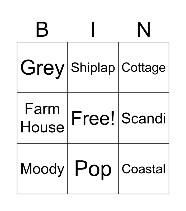 This bingo card has a free space and 8 words: Scandi, Cottage, Shiplap, Moody, Grey, Coastal, Farm House and Pop.
