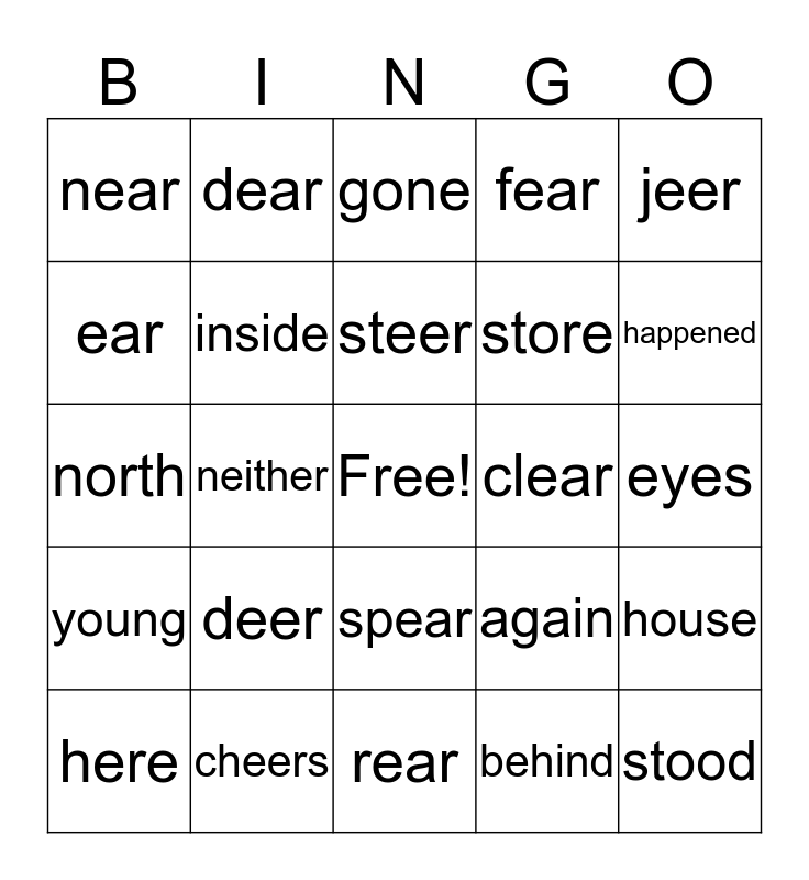 This bingo card has a free space and 24 words: deer, cheers, steer, here, jeer, near, ear, dear, clear, spear, store, north, again, house, inside, behind, eyes, gone, happened, neither, stood, young, fear and rear.