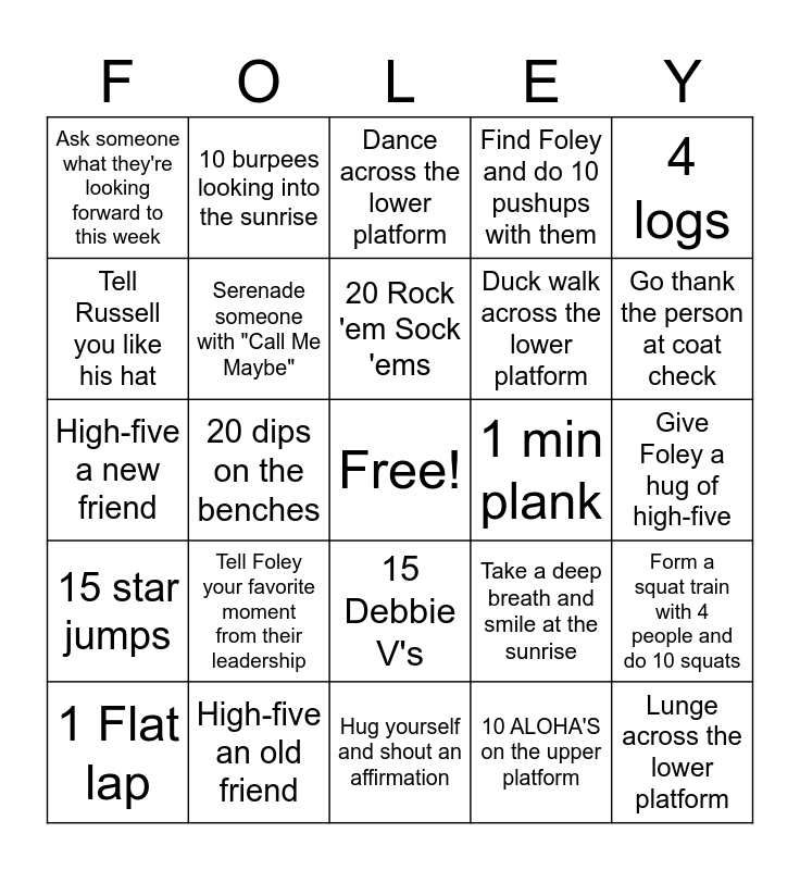 This bingo card has a free space and 24 words: Tell Foley your favorite moment from their leadership, High-five an old friend, 20 Rock 'em Sock 'ems, 1 Flat lap, 4 logs, Ask someone what they're looking forward to this week, Tell Russell you like his hat, 10 burpees looking into the sunrise, 1 min plank, 15 Debbie V's, Duck walk across the lower platform, High-five a new friend, Take a deep breath and smile at the sunrise, Form a squat train with 4 people and do 10 squats, Serenade someone with "Call Me Maybe", 10 ALOHA'S on the upper platform, Give Foley a hug of high-five, Dance across the lower platform, Go thank the person at coat check, 20 dips on the benches, Lunge across the lower platform, 15 star jumps, Find Foley and do 10 pushups with them and Hug yourself and shout an affirmation.