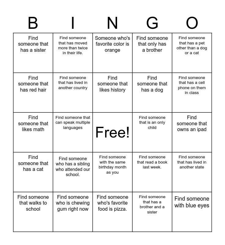 This bingo card has a free space and 24 words: Find someone who has a sibling who attended our school., Find someone who is chewing gum right now, Find someone that likes history, Find someone that walks to school, Find someone that has a pet other than a dog or a cat, Find someone that has a sister, Find someone that has red hair, Find someone that has moved more than twice in their life., Find someone that is an only child, Find someone with the same birthday month as you, Find someone that has a dog, Find someone that likes math, Find someone that read a book last week., Find someone that has lived in another state, Find someone that has lived in another country, Find someone that has a brother and a sister, Find someone that owns an ipad, Someone who's favorite color is orange, Find someone that has a cell phone on them in class, Find someone that can speak multiple languages, Find someone with blue eyes, Find someone that has a cat, Find someone that only has a brother and Find someone who's favorite food is pizza..