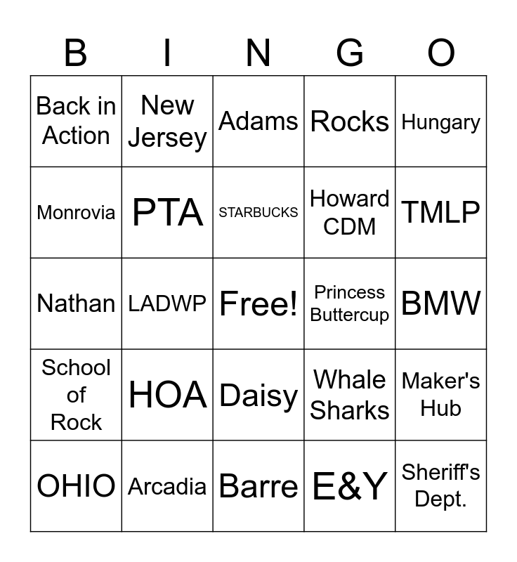 This bingo card has a free space and 24 words: HOA, Arcadia, STARBUCKS, OHIO, Hungary, Back in Action, Monrovia, New Jersey, Princess Buttercup, Daisy, Howard CDM, Nathan, Whale Sharks, Maker's Hub, PTA, E&Y, BMW, Adams, TMLP, LADWP, Sheriff's Dept., School of Rock, Rocks and Barre.