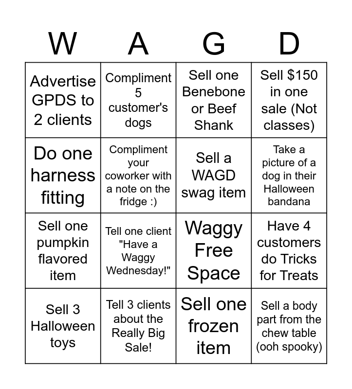This bingo card has 16 words: Tell 3 clients about the Really Big Sale!, Have 4 customers do Tricks for Treats, Sell one Benebone or Beef Shank, Advertise GPDS to 2 clients, Sell one pumpkin flavored item, Compliment 5 customer's dogs, Waggy Free Space, Sell one frozen item, Do one harness fitting, Compliment your coworker with a note on the fridge :), Sell 3 Halloween toys, Sell $150 in one sale (Not classes), Tell one client "Have a Waggy Wednesday!", Take a picture of a dog in their Halloween bandana, Sell a WAGD swag item and Sell a body part from the chew table (ooh spooky).