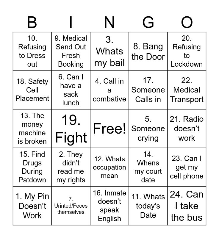 This bingo card has a free space and 24 words: 1. My Pin Doesn’t Work, 2. They didn’t read me my rights, 4. Call in a combative, 11. Whats today’s Date, 20. Refusing to Lockdown, 10. Refusing to Dress out, 9. Medical Send Out Fresh Booking, 3. Whats my bail, 5. Someone crying, 21. Radio doesn’t work, 13. The money machine is broken, 6. Can I have a sack lunch, 14. Whens my court date, 23. Can I get my cell phone, 18. Safety Cell Placement, 7. Urinted/Feces themselves, 16. Inmate doesn’t speak English, 8. Bang the Door, 22. Medical Transport, 15. Find Drugs During Patdown, 19. Fight, 12. Whats occupation mean, 17. Someone Calls in and 24. Can I take the bus.
