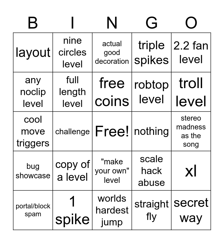 This bingo card has a free space and 29 words: portal/block spam, impossible, challenge, auto level, layout, actual good decoration, full length level, copy of a level, nothing, 1 spike, stereo madness as the song, secret way, worlds hardest jump, straight fly, troll level, art, "make your own" level, bug showcase, 2.2 fan level, cool move triggers, scale hack abuse, any youtuber challenge, robtop level, any noclip level, triple spikes, nine circles level, xl, free coins and clubstep monster.
