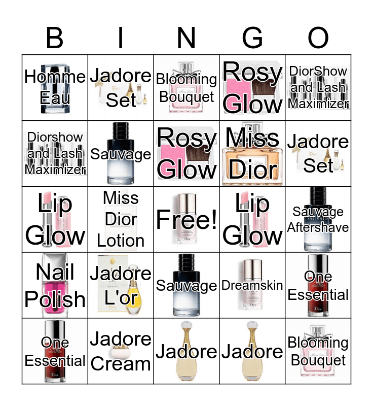 This bingo card has 24 images, a free space and 24 words: Jadore L'or, Jadore Cream, Rosy Glow, One Essential, DiorShow and Lash Maximizer, Homme Eau, Diorshow and Lash Maximizer, Jadore Set, Lip Glow, Sauvage, Miss Dior, Lip Glow, Dreamskin, One Essential, Sauvage, Jadore, Sauvage Aftershave, Blooming Bouquet, Jadore Set, Miss Dior Lotion, Blooming Bouquet, Nail Polish, Rosy Glow and Jadore.