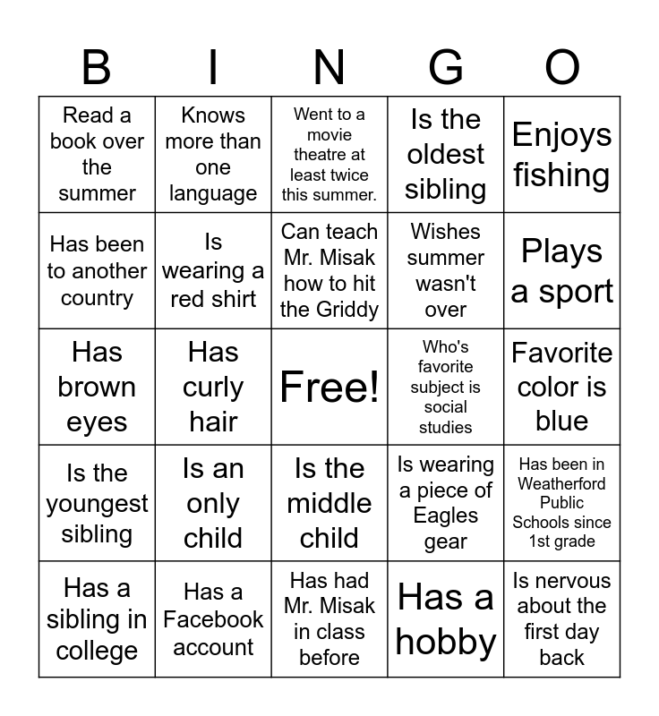 This bingo card has a free space and 24 words: Has a sibling in college, Is an only child, Can teach Mr. Misak how to hit the Griddy, Has a hobby, Enjoys fishing, Read a book over the summer, Knows more than one language, Went to a movie theatre at least twice this summer., Who's favorite subject is social studies, Favorite color is blue, Has brown eyes, Is wearing a red shirt, Is wearing a piece of Eagles gear, Has been in Weatherford Public Schools since 1st grade, Has been to another country, Has a Facebook account, Has had Mr. Misak in class before, Is the oldest sibling, Plays a sport, Is the youngest sibling, Has curly hair, Is the middle child, Wishes summer wasn't over and Is nervous about the first day back.