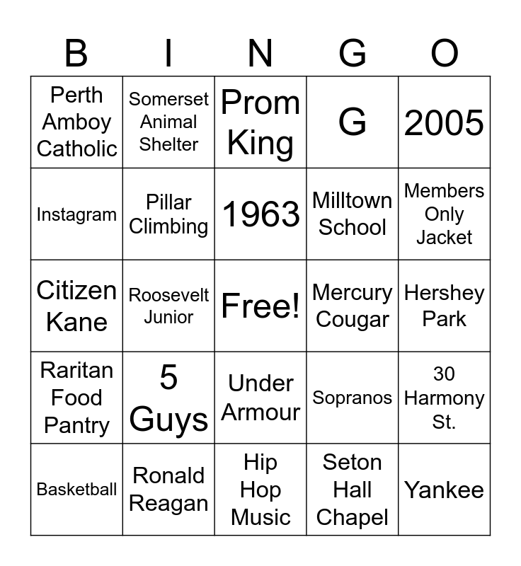 This bingo card has a free space and 109 words: Juice Wrld, Jason Mraz, Mercury Cougar, First Born, Lefty, Beatles, U2, Travis Scott, Eisenhower School, BRHS, Grant School, Tiffanys, The Wiggles, Iron Man, Marvel Avengers, Blues Clue, Citizen Kane, Kelly Clarkson, Madonna, Taylor Swift, 30 Harmony St., April 15, August 30, Aries, Virgo, 1963, 2005, South Plainfield, Westfield, Fords, Members Only Jacket, G, Prom King, 5th gr Undefeated Basketball, Panthers, Yankee, Seattle Seahawks, Aaron Judge, Ronald Reagan, Mike & the Mad Dog, Ben Shapiro, Sacred Heart School, Milltown School, Roosevelt Junior, Sopranos, Abbott & Costello, Classic Howard Stern, Fairfield U, FDU, September 24, Bar Trivia Game, Hurrican Floyd, Seton Hall Chapel, 1 Sylvan drive, Hobby Lobby, 2023, Green Day, Bruno Mars, Black Eyed Peas, Pillar Climbing, Perth Amboy Catholic, Bowcraft, Spanish, EP, The Price is Right, Williams-Sonoma Cooking Class, Reading Cinema, HomePlate Catering, JCC, LifeTime Fitness, Bridgewater YMCA, Somerset Animal Shelter, Raritan Food Pantry, BRMS, Black/Gold Karate Belt, Lake George, Hershey Park, Nestle Crunch, Rita's Cotton Candy, Popcorn Chicken, Juice Box, Point Pleasant Beach, 2nd Base, S'mores, Captain America, UNOS, Somerset Patriot, Sebastian, Instagram, Candy Lane, Chutes & Ladders, 5 Guys, Game Stop, Baby Raspberry, C4 Energy Drink, 5-hour Energy, Biosteel, Ice Cream Cake, Hip Hop Music, Mayfair Farms, Abuelita, Baseball, Basketball, Under Armour, Pepperoni & Sausage Pizza, DelMonico Steak, GH, Mazda CX3 and Ford Escape.