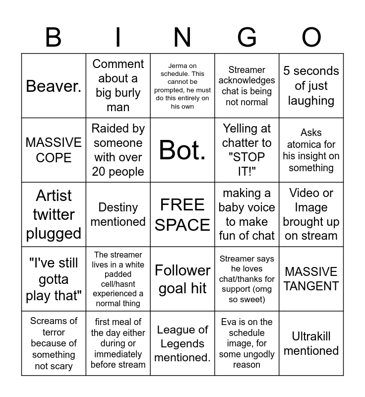 This bingo card has a free space and 39 words: Hifi-Rush OST, DBD, 30 minutes+ to start a game, Raided by someone with over 20 people, Screams of terror because of something not scary, Follower goal hit, Bot., Negative reaction to bald 3 different times, 5 seconds of just laughing, "I've still gotta play that", Destiny mentioned, Streamer acknowledges chat is being not normal, Ultrakill mentioned, Video or Image brought up on stream, making a baby voice to make fun of chat, The streamer lives in a white padded cell/hasnt experienced a normal thing, The streamer threatens a chatter, Beaver., Weird story, Streamer says he loves chat/thanks for support (omg so sweet), MASSIVE COPE, League of Legends mentioned., Yelling at chatter to "STOP IT!", Asks atomica for his insight on something, Making up a strange story from one thought, The streamer calls himself bad, The streamer yells at an NPC, Artist complimented, Clearly sick of a redeem, Comment about a big burly man, New VIP, Streamer is clearly taken back by a message, Jerma on schedule. This cannot be prompted, he must do this entirely on his own, first meal of the day either during or immediately before stream, Eva is on the schedule image, for some ungodly reason, At least one slot on schedule is essentially "IDK", MASSIVE TANGENT, Artist twitter plugged and unprompted strange noise.