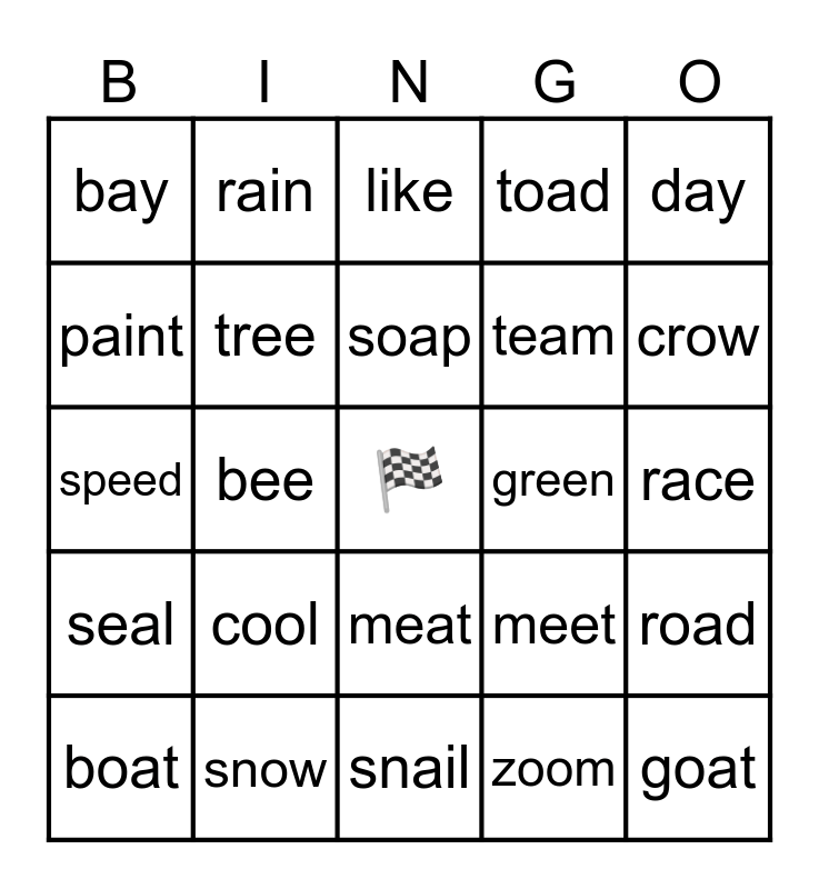 This bingo card has a free space and 24 words: cool, snow, soap, boat, day, bay, paint, rain, green, meat, team, speed, meet, road, tree, zoom, race, like, crow, bee, goat, seal, toad and snail.