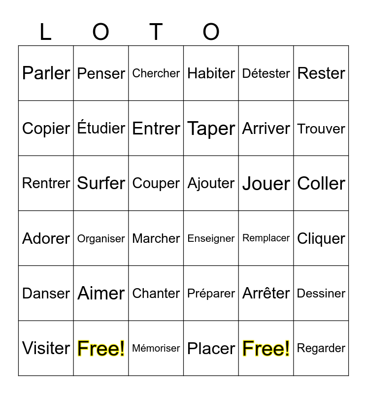 This bingo card has 36 words: Préparer, Chanter, Placer, Copier, Adorer, Ajouter, Étudier, Mémoriser, Détester, Arrêter, Trouver, Habiter, Dessiner, Surfer, Taper, Parler, Danser, Jouer, Rentrer, Chercher, Couper, Organiser, Enseigner, Marcher, Remplacer, Penser, Arriver, Free!, Entrer, Rester, Regarder, Visiter, Cliquer, Coller, Aimer and Free!.