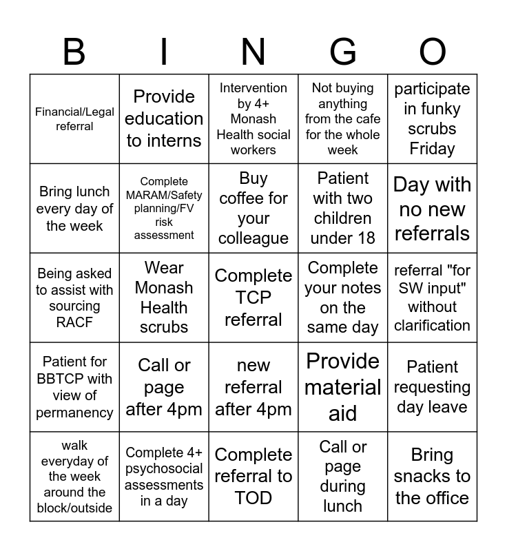 This bingo card has a free space and 24 words: Call or page after 4pm, Complete 4+ psychosocial assessments in a day, Buy coffee for your colleague, walk everyday of the week around the block/outside, participate in funky scrubs Friday, Financial/Legal referral, Bring lunch every day of the week, Provide education to interns, Complete your notes on the same day, new referral after 4pm, Patient with two children under 18, Being asked to assist with sourcing RACF, Provide material aid, Patient requesting day leave, Complete MARAM/Safety planning/FV risk assessment, Call or page during lunch, referral "for SW input" without clarification, Intervention by 4+ Monash Health social workers, Day with no new referrals, Wear Monash Health scrubs, Bring snacks to the office, Patient for BBTCP with view of permanency, Not buying anything from the cafe for the whole week and Complete referral to TOD.
