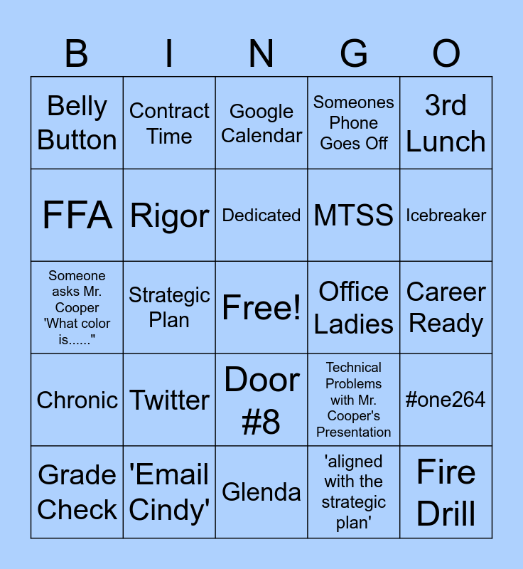 This bingo card has a free space and 39 words: Convocation, Vision Statement, Former Student, Rigor, Grade Check, Door #8, Dedicated, Football, 3rd Lunch, Chronic, Strategic Plan, Someones Phone Goes Off, Fire Drill, Career Ready, Office Ladies, Twitter, Differentiated, Belly Button, Garry Welch, Technical Problems with Mr. Cooper's Presentation, FFA, Glenda, MTSS, Icebreaker, State testing, Think outside the box, Formative Assessment, 'In Winfield..., Concussion, Contract Time, Clock, Proactive, Google Calendar, 'Email Cindy', 'aligned with the strategic plan', picture of a ladder is used in presentation, #one264, Someone asks Mr. Cooper 'What color is......" and Technology.