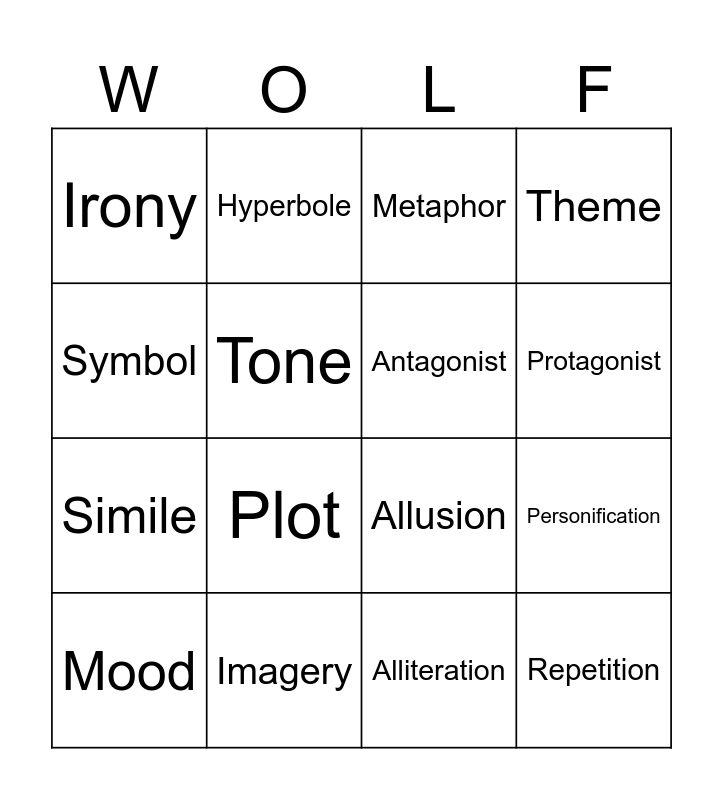 This bingo card has 16 words: Imagery, Personification, Metaphor, Irony, Simile, Hyperbole, Allusion, Alliteration, Symbol, Tone, Mood, Theme, Plot, Protagonist, Antagonist and Repetition.