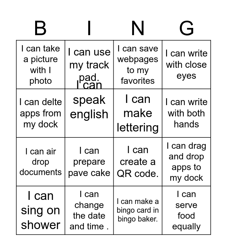 This bingo card has 16 words: I can change the date and time ., I can drag and drop apps to my dock, I can save webpages to my favorites, I can take a picture with I photo, I can air drop documents, I can use my track pad., I can create a QR code., I can make a bingo card in bingo baker., I can delte apps from my dock, I can speak english, I can sing on shower, I can write with close eyes, I can prepare pave cake, I can write with both hands, I can make lettering and I can serve food equally.