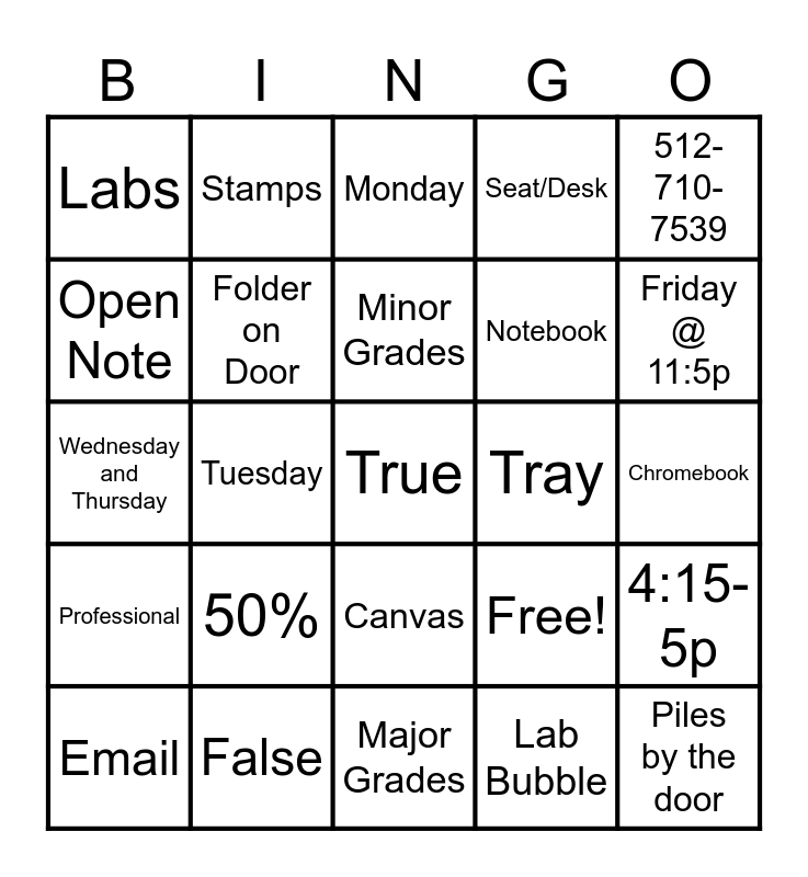 This bingo card has 25 words: 50%, Major Grades, Minor Grades, Email, 512-710-7539, Labs, Open Note, Stamps, Tray, Canvas, Notebook, Wednesday and Thursday, Free!, 4:15-5p, Folder on Door, Piles by the door, Chromebook, Monday, Friday @ 11:5p, Tuesday, True, False, Professional, Seat/Desk and Lab Bubble.