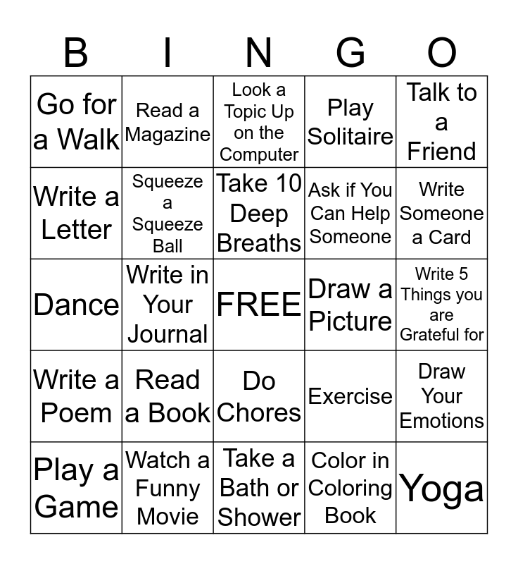 This bingo card has a free space and 24 words: Read a Book, Watch a Funny Movie, Take 10 Deep Breaths, Play a Game, Talk to a Friend, Go for a Walk, Write a Letter, Read a Magazine, Draw a Picture, Do Chores, Ask if You Can Help Someone, Dance, Exercise, Draw Your Emotions, Squeeze a Squeeze Ball, Color in Coloring Book, Write 5 Things you are Grateful for, Look a Topic Up on the Computer, Write Someone a Card, Write in Your Journal, Yoga, Write a Poem, Play Solitaire and Take a Bath or Shower.