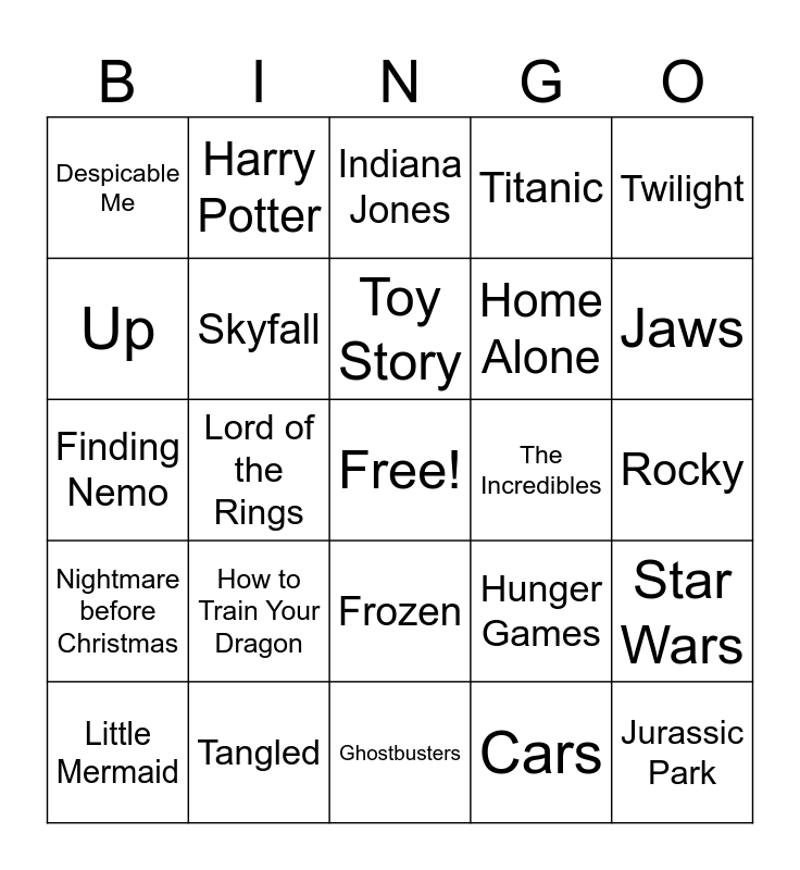 This bingo card has a free space and 26 words: Frozen, Cars, Toy Story, Tangled, Twilight, Despicable Me, Up, Harry Potter, Rocky, Hunger Games, Home Alone, Finding Nemo, Star Wars, Little Mermaid, Lord of the Rings, Pirates of the Caribbean, Titanic, Nightmare before Christmas, Indiana Jones, Jurassic Park, Jaws, Ghostbusters, The Incredibles, How to Train Your Dragon, Skyfall and The Godfather.