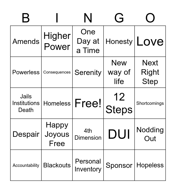 This bingo card has a free space and 24 words: Happy Joyous Free, Blackouts, Serenity, Accountability, Love, Amends, Powerless, Higher Power, 12 Steps, 4th Dimension, New way of life, Jails Institutions Death, DUI, Nodding Out, Consequences, Sponsor, Shortcomings, One Day at a Time, Next Right Step, Homeless, Hopeless, Despair, Honesty and Personal Inventory.