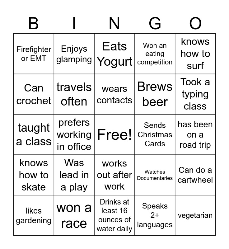This bingo card has a free space and 40 words: Ran in a marathon, taught a class, won at casino, travels often, won a race, works out after work, wears contacts, has a work playlist, knows how to surf, knows how to skate, prefers working in office, Won an eating competition, vegetarian, has been on a road trip, Sends Christmas Cards, Was lead in a play, has a side hustle, Firefighter or EMT, Does Yoga, Eats Yogurt, Can do a cartwheel, Speaks 2+ languages, Brews beer, Can crochet, Can Knit, Busy lunch every day, Appeared in a movie, Likes to Dance, Does NOT like to fly, Enjoys journaling, Works on cars, likes gardening, Enjoys reading, Watches Documentaries, Took a typing class, Drinks at least 16 ounces of water daily, has a pet, Has gone camping, Enjoys glamping and Has received a pedicure.