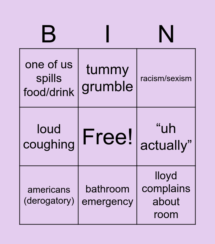 This bingo card has a free space and 8 words: “uh actually”, racism/sexism, tummy grumble, americans (derogatory), one of us spills food/drink, lloyd complains about room, loud coughing and bathroom emergency.