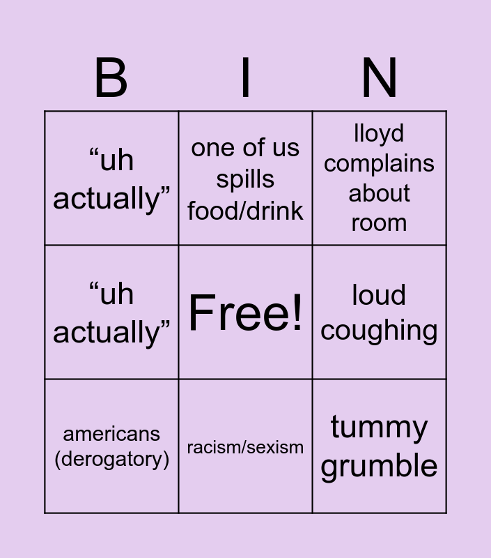 This bingo card has a free space and 11 words: “uh actually”, racism/sexism, tummy grumble, americans (derogatory), one of us spills food/drink, lloyd complains about room, loud coughing, bathroom emergency, “uh actually”, “uh actually” and “uh actually”.
