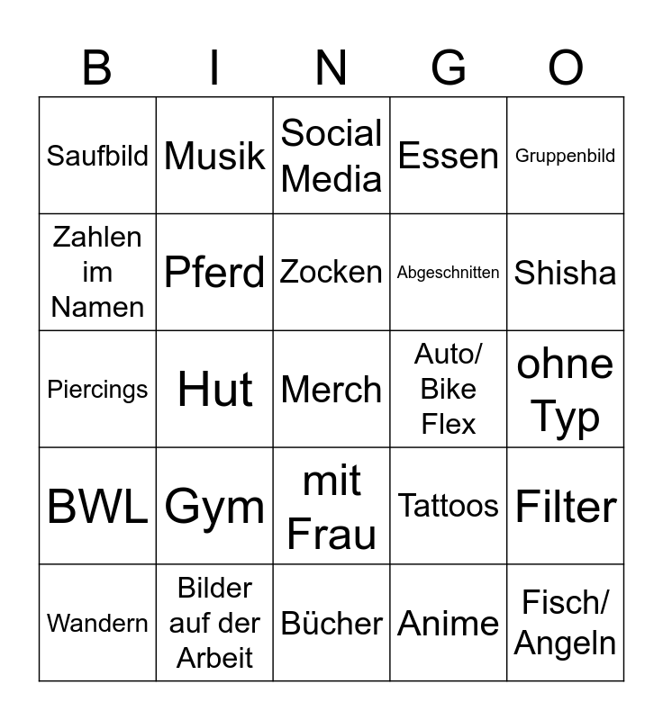 This bingo card has 25 words: Gym, Bücher, Zocken, Wandern, Gruppenbild, Saufbild, Zahlen im Namen, Musik, Auto/ Bike Flex, mit Frau, Abgeschnitten, Piercings, Tattoos, Filter, Pferd, Fisch/ Angeln, ohne Typ, Social Media, Shisha, Hut, Merch, Bilder auf der Arbeit, BWL, Essen and Anime.