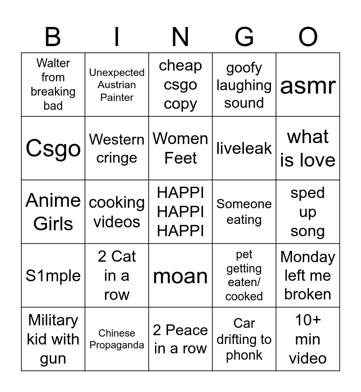 This bingo card has a free space and 24 words: 2 Cat in a row, Chinese Propaganda, Women Feet, Military kid with gun, asmr, Walter from breaking bad, Csgo, Unexpected Austrian Painter, Someone eating, moan, liveleak, Anime Girls, pet getting eaten/ cooked, Monday left me broken, Western cringe, Car drifting to phonk, sped up song, cheap csgo copy, what is love, cooking videos, 10+ min video, S1mple, goofy laughing sound and 2 Peace in a row.
