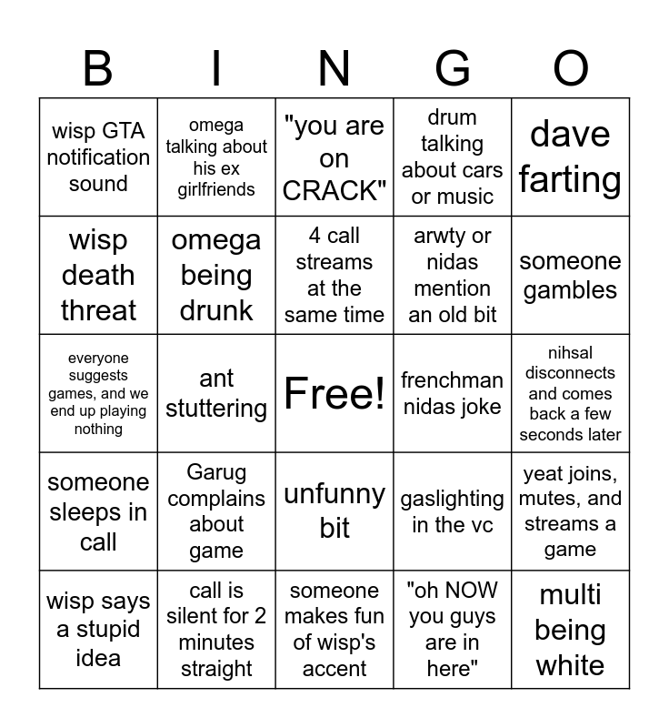 This bingo card has a free space and 24 words: Garug complains about game, call is silent for 2 minutes straight, 4 call streams at the same time, wisp says a stupid idea, dave farting, wisp GTA notification sound, wisp death threat, omega talking about his ex girlfriends, frenchman nidas joke, unfunny bit, arwty or nidas mention an old bit, everyone suggests games, and we end up playing nothing, gaslighting in the vc, yeat joins, mutes, and streams a game, omega being drunk, "oh NOW you guys are in here", nihsal disconnects and comes back a few seconds later, "you are on CRACK", someone gambles, ant stuttering, multi being white, someone sleeps in call, drum talking about cars or music and someone makes fun of wisp's accent.