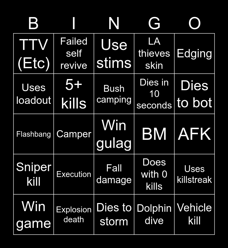 This bingo card has a free space and 24 words: Win game, Execution, Bush camping, Dolphin dive, Edging, TTV (Etc), Failed self revive, Use stims, BM, AFK, Flashbang, 5+ kills, Does with 0 kills, Uses killstreak, Uses loadout, Explosion death, Dies to storm, LA thieves skin, Dies to bot, Sniper kill, Camper, Fall damage, Dies in 10 seconds and Vehicle kill.