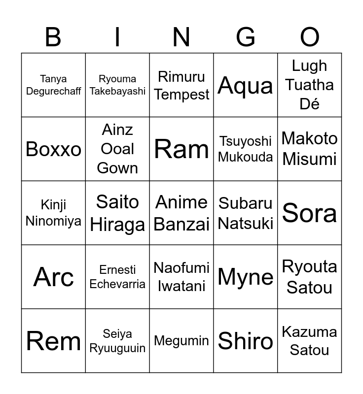 This bingo card has a free space and 30 words: Seiya Ryuuguuin, Louise Françoise, Saito Hiraga, Touya Mochizuki, Tanya Degurechaff, Rimuru Tempest, Ainz Ooal Gown, Naofumi Iwatani, Subaru Natsuki, Megumin, Sora, Kazuma Satou, Shiro, Kazuya Souma, Makoto Misumi, Kumoko, Myne, Arc, Ernesti Echevarria, Lugh Tuatha Dé, Kinji Ninomiya, Kelvin, Ryouma Takebayashi, Tsuyoshi Mukouda, Boxxo, Aqua, Ryouta Satou, Rem, Ram and Filo.