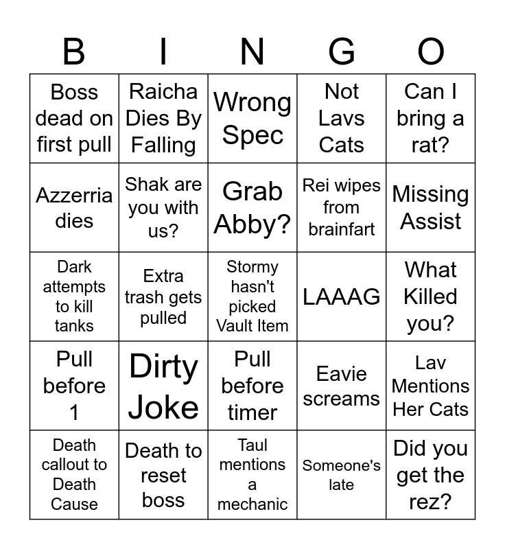 This bingo card has a free space and 29 words: Death callout to Death Cause, Forgot to Hero, Extra trash gets pulled, Open Mic Swears, Boss dead on first pull, Wrong Spec, Shak are you with us?, Dirty Joke, LAAAG, Death to reset boss, What Killed you?, Did you get the rez?, Taul mentions a mechanic, Someone's late, Missing Assist, Did we ready check?, Pull before timer, Pull before 1, Can I bring a rat?, Dark attempts to kill tanks, Eavie screams, Pernie says feet, Rei wipes from brainfart, Azzerria dies, Not Lavs Cats, Raicha Dies By Falling, Lav Mentions Her Cats, Grab Abby? and First Pull Boss Kill.