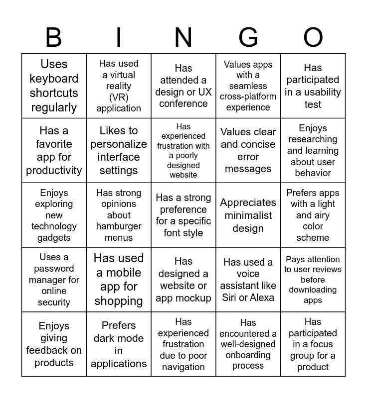 This bingo card has a free space and 24 words: Has used a mobile app for shopping, Prefers dark mode in applications, Has experienced frustration with a poorly designed website, Enjoys giving feedback on products, Has participated in a usability test, Uses keyboard shortcuts regularly, Has a favorite app for productivity, Has used a virtual reality (VR) application, Appreciates minimalist design, Has designed a website or app mockup, Values clear and concise error messages, Enjoys exploring new technology gadgets, Has used a voice assistant like Siri or Alexa, Pays attention to user reviews before downloading apps, Likes to personalize interface settings, Has encountered a well-designed onboarding process, Prefers apps with a light and airy color scheme, Has attended a design or UX conference, Enjoys researching and learning about user behavior, Has strong opinions about hamburger menus, Has participated in a focus group for a product, Uses a password manager for online security, Values apps with a seamless cross-platform experience and Has experienced frustration due to poor navigation.