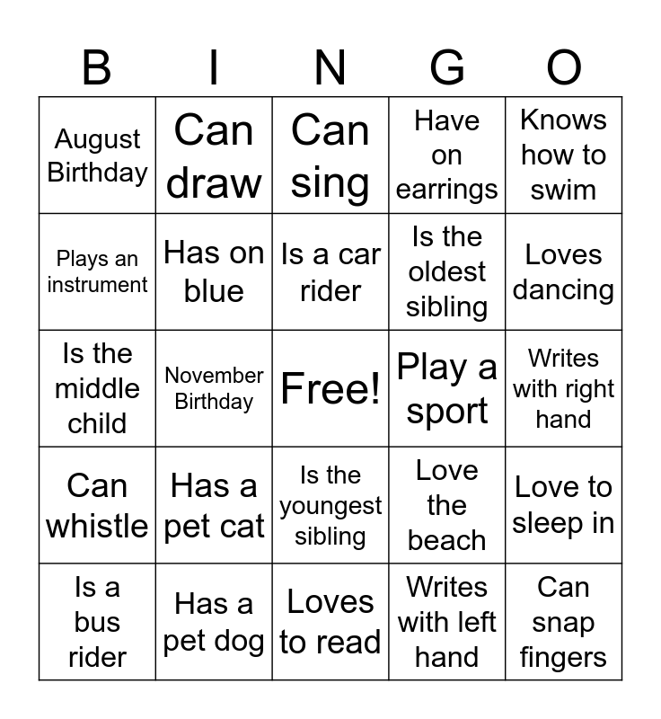 This bingo card has a free space and 24 words: Has a pet cat, Has a pet dog, Is a car rider, Is a bus rider, Knows how to swim, August Birthday, Plays an instrument, Can draw, Play a sport, Is the youngest sibling, Is the oldest sibling, Is the middle child, Love the beach, Love to sleep in, Has on blue, Writes with left hand, Writes with right hand, Can sing, Loves dancing, November Birthday, Can snap fingers, Can whistle, Have on earrings and Loves to read.