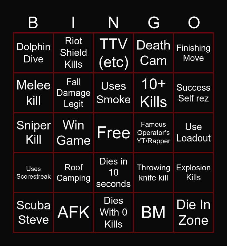 This bingo card has a free space and 24 words: Scuba Steve, Roof Camping, Uses Smoke, BM, Finishing Move, Dolphin Dive, Riot Shield Kills, TTV (etc), Famous Operator’s YT/Rapper, Use Loadout, Sniper Kill, Fall Damage Legit, Throwing knife kill, Explosion Kills, Melee kill, AFK, Dies With 0 Kills, Death Cam, Success Self rez, Uses Scorestreak, Win Game, Dies in 10 seconds, 10+ Kills and Die In Zone.