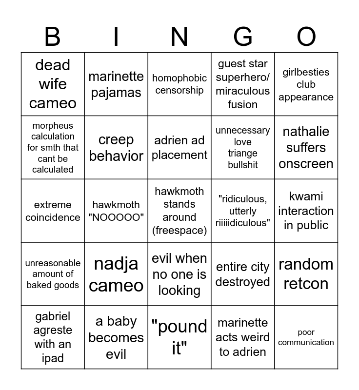 This bingo card has a free space and 32 words: marinette acts weird to adrien, ice cream man, hawkmoth "NOOOOO", adrien family trauma, unreasonable amount of baked goods, creep behavior, girlbesties club appearance, random retcon, marinette pajamas, someone starts singing, adrien ad placement, homophobic censorship, eiffel tower, pigeon man appearance, "ridiculous, utterly riiiiidiculous", luka unreasonably calm and forgiving, gabriel agreste with an ipad, extreme coincidence, evil when no one is looking, nadja cameo, entire city destroyed, camembert OR macarons mentioned, kwami interaction in public, a baby becomes evil, poor communication, guest star superhero/ miraculous fusion, unnecessary love triange bullshit, morpheus calculation for smth that cant be calculated, dead wife cameo, "pound it", time travel and nathalie suffers onscreen.
