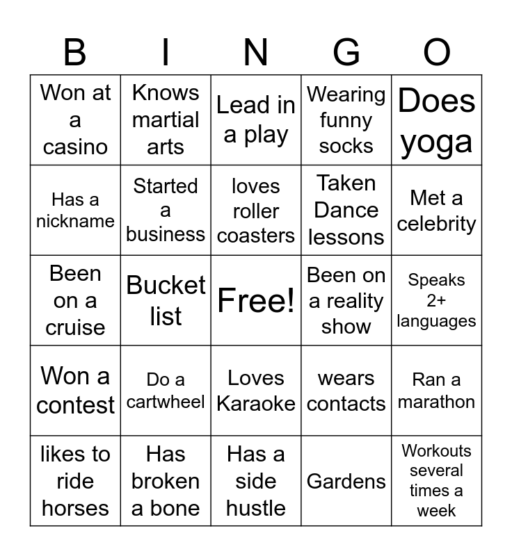 This bingo card has a free space and 24 words: Do a cartwheel, Has broken a bone, loves roller coasters, likes to ride horses, Does yoga, Won at a casino, Has a nickname, Knows martial arts, Been on a reality show, Loves Karaoke, Taken Dance lessons, Been on a cruise, wears contacts, Ran a marathon, Started a business, Gardens, Speaks 2+ languages, Lead in a play, Met a celebrity, Bucket list, Workouts several times a week, Won a contest, Wearing funny socks and Has a side hustle.
