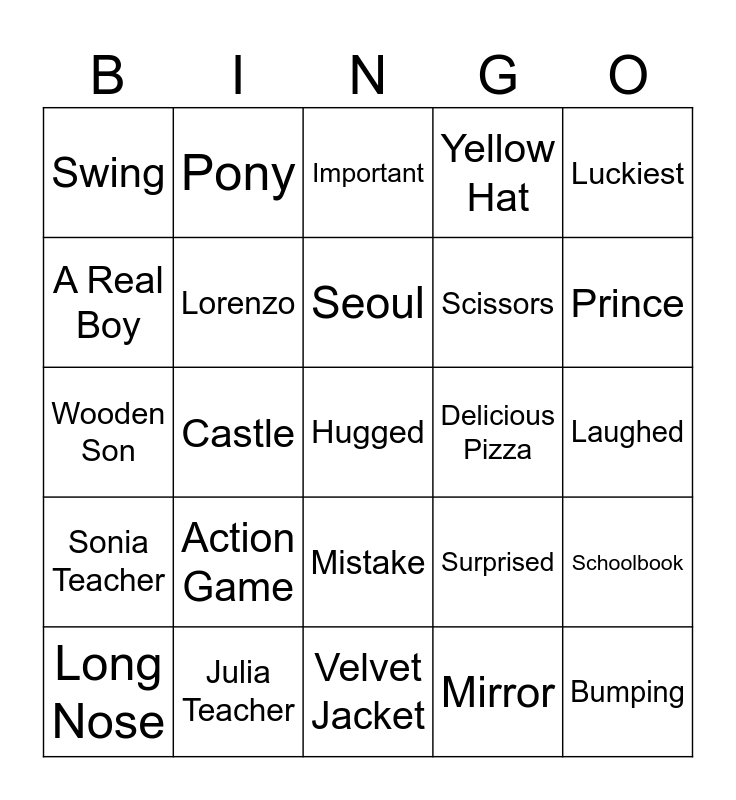 This bingo card has 25 words: Action Game, Velvet Jacket, Seoul, Long Nose, Luckiest, Swing, A Real Boy, Pony, Delicious Pizza, Mistake, Scissors, Wooden Son, Surprised, Schoolbook, Lorenzo, Bumping, Laughed, Important, Prince, Castle, Hugged, Julia Teacher, Sonia Teacher, Yellow Hat and Mirror.