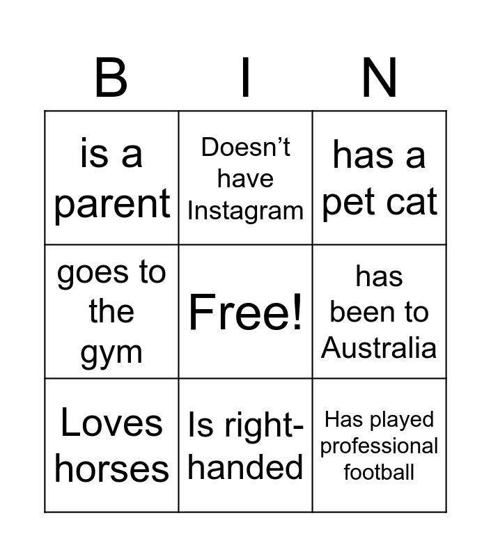 This bingo card has a free space and 81 words: Loves sushi, has a pet dog, has a pet cat, loves chocolate, loves sweets, loves Indian food, loves Chinese food, loves Mexican food, loved Thai food, is a skier, is a snowboarder, has ran a marathon, goes to the gym, is a parent, has been to New York, has been to Australia, has been to Thailand, has been to Singapore, has been to Spain, Has been to Dubai, Has lived in another country, Has played professional football, Is left-handed, Is right-handed, Loves horses, Made a New Year’s resolution and keeping to it, Loves to sleep-in, Is in the 5am club, Loves to read, Collects special 50ps, Wears glasses, Wears contact lenses, Changes their hair all the time, Plays a musical instrument, Has watched their favourite film more than 10 times, Is the eldest child, Is the youngest child, Speaks 2 or more languages, Hates spiders, Doesn’t like bananas, Loves camping, Loves reading, Has a piercing, Can whistle, Has a tattoo, Doesn’t eat meat, Doesn’t have Instagram, Doesn’t have Facebook, Doesn’t have linked in, Works better at night, Is a morning person, Prefers Pepsi to Coke, Is related to a celebrity, Bikes to work, Was born on Christmas day, Has taken a cruise, Has visited 30 or more countries, Works out before work, Has broken a bone, Has a nickname, Loves karaoke, Is a twin, Has a bucket list, Loves rollercoasters, Favourite meal is breakfast, Favourite meal is lunch, Favourite meal is dinner, Gardens, Brews beer, Is left handed, Rides horses, Has a side hustle, Can do a cartwheel, Can do a handstand, Know how to surf, Reads 10+ books a year, Owns crypto currency, Send Christmas cards, Has met a celebrity, Has won at a casino and Loves escape rooms.