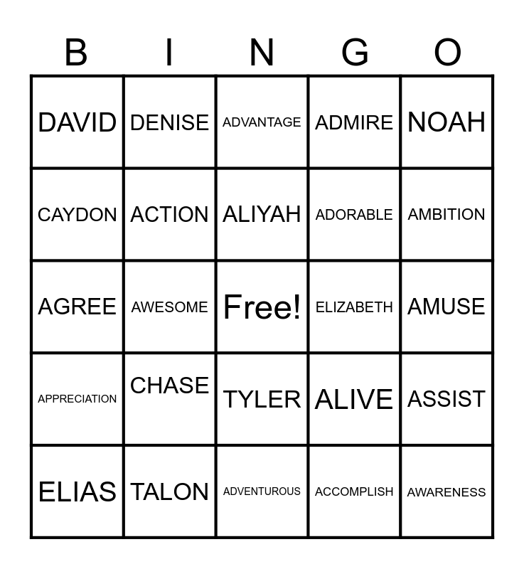This bingo card has a free space and 24 words: CHASE, TALON, ALIYAH, ELIAS, NOAH, DAVID, CAYDON, DENISE, ELIZABETH, TYLER, ADORABLE, AGREE, ALIVE, ASSIST, ACTION, ACCOMPLISH, AMUSE, ADVANTAGE, AMBITION, AWESOME, AWARENESS, APPRECIATION, ADMIRE and ADVENTUROUS.