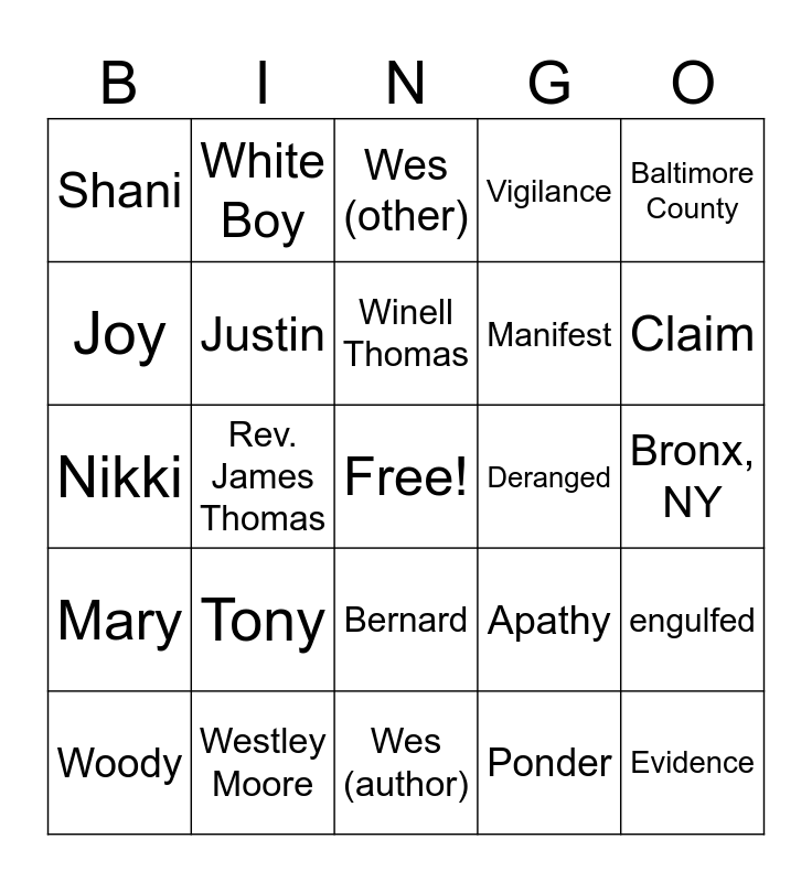 This bingo card has a free space and 24 words: Woody, Tony, Winell Thomas, Ponder, Baltimore County, Shani, White Boy, Wes (other), Deranged, Bronx, NY, Nikki, Justin, Apathy, engulfed, Joy, Westley Moore, Wes (author), Vigilance, Claim, Mary, Rev. James Thomas, Bernard, Manifest and Evidence.