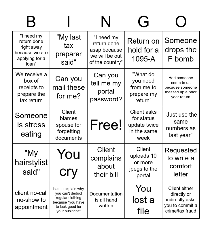 This bingo card has a free space and 35 words: Can I use your bathroom quick, What's the last day I can drop off my information?, I just have a quick question, Can you mail these for me?, Client complains about their bill, Return on hold for a 1095-A, We receive a box of receipts to prepare the tax return, Someone calls all 6 phone extensions in a row, Can you tell me my portal password?, Why do I owe so much?, Someone is stress eating, Someone drops the F bomb, "Someone on Tik Tok said......", "I have more deductions if we need them", "I need my return done right away because we are applying for a loan", Client asks for status update twice in the same week, You lost a file, Client blames spouse for forgetting documents, "My hairstylist said", Client either directly or indirectly asks you to commit a crime/tax fraud, Client uploads 10 or more jpegs to the portal, client no-call no-show to appointment, Requested to write a comfort letter, had to explain why you can't deduct regular clothing because "you have to look good for your business", "I need my return done asap because we will be out of the country", Had someone come to us because someone messed up a prior year return, Client asks us why they haven't gotten their refund yet, "I thought Geoff was preparing my tax return" or, "I'd rather talk to Geoff", "What do you need from me to prepare my return", "Just use the same numbers as last year", No bank recs are done, Documentation is all hand written, You cry, "My last tax preparer said" and Client gives you unopened "important tax documents mail".