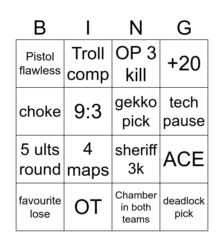 This bingo card has 16 words: OT, ACE, OP 3 kill, Pistol flawless, 5 ults round, Troll comp, sheriff 3k, Chamber in both teams, choke, 9:3, favourite lose, +20, 4 maps, tech pause, gekko pick and deadlock pick.