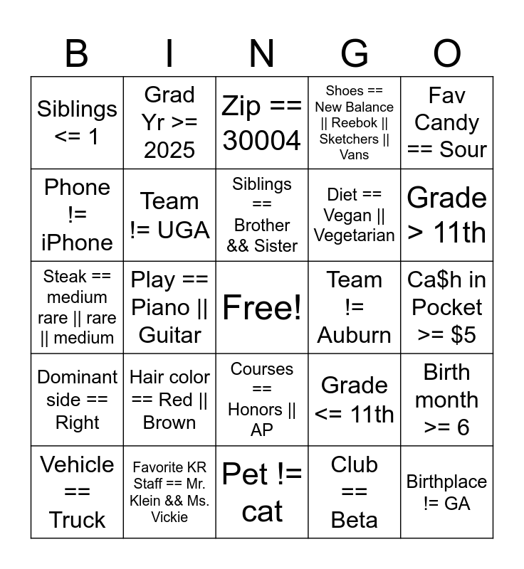 This bingo card has a free space and 31 words: Pet != cat, Eyes == Blue, Play == Piano || Guitar, Age >= 16, Siblings <= 1, Zip == 30004, Team != UGA, Grade <= 11th, Team != Auburn, Club == Beta, Ca$h in Pocket >= $5, Birthplace != GA, Pet == lizard || Fish, Pet == Dog && Cat, Grade > 11th, Fav Music != Country || Rap, Birth month >= 6, Hair color == Red || Brown, Dominant side == Right, Courses == Honors || AP, Fav Candy == Sour, Hair color == Blonde, Vehicle == Truck, Grad Yr >= 2025, Diet == Vegan || Vegetarian, Phone != iPhone, Shoes == New Balance || Reebok || Sketchers || Vans, Steak == medium rare || rare || medium, Favorite KR Staff == Mr. Klein && Ms. Vickie, Siblings == Brother && Sister and Doritos != Blue.