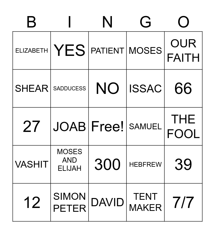 This bingo card has a free space and 24 words: MOSES AND ELIJAH, SIMON PETER, NO, 12, OUR FAITH, ELIZABETH, SHEAR, YES, SAMUEL, 300, ISSAC, 27, HEBFREW, 39, SADDUCESS, TENT MAKER, THE FOOL, PATIENT, 66, JOAB, 7/7, VASHIT, MOSES and DAVID.