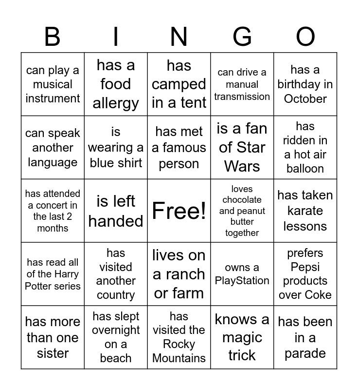 This bingo card has a free space and 24 words: has visited another country, has slept overnight on a beach, has met a famous person, has more than one sister, has a birthday in October, can play a musical instrument, can speak another language, has a food allergy, loves chocolate and peanut butter together, lives on a ranch or farm, is a fan of Star Wars, has attended a concert in the last 2 months, owns a PlayStation, prefers Pepsi products over Coke, is wearing a blue shirt, knows a magic trick, has taken karate lessons, has camped in a tent, has ridden in a hot air balloon, is left handed, has been in a parade, has read all of the Harry Potter series, can drive a manual transmission and has visited the Rocky Mountains.