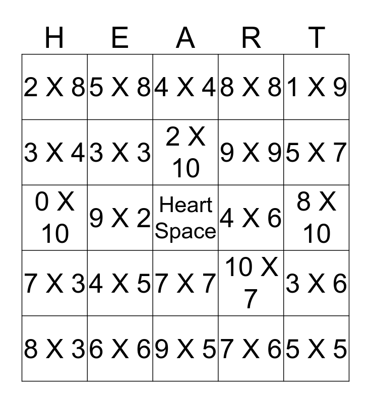 This bingo card has a free space and 24 words: 4 X 5, 6 X 6, 2 X 10, 8 X 3, 1 X 9, 2 X 8, 3 X 4, 5 X 8, 4 X 6, 7 X 7, 9 X 9, 0 X 10, 10 X 7, 3 X 6, 3 X 3, 7 X 6, 8 X 10, 4 X 4, 5 X 7, 9 X 2, 5 X 5, 7 X 3, 8 X 8 and 9 X 5.