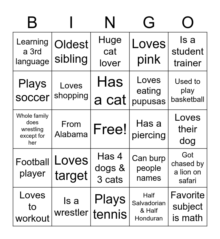 This bingo card has a free space and 52 words: Bilingual, Favorite subject is math, Lowkey a nerd, Plays tennis, Loves target, Loves marine animals, Oldest sibling, Loves canes sauce, Plays soccer, Plays the flute, Loves shopping, Has a depop account, Got chased by a lion on safari, Can burp people names, Is taller than their mom, Is a junior, Has a cat, Has a piercing, Does not like chicken, Is a student trainer, From Alabama, Half Salvadorian & Half Honduran, Learning a 3rd language, Loves eating pupusas, Is Salvadorian, Speaks Portuguese, Has 3 siblings, In FFA, Used to play basketball, Likes to fish, Has two cats, Loves pink, Is a sophomore, Big harry potter fan, Loves changing hair color & nails, Huge cat lover, Is a wrestler, Qualified for state, Likes sweet tea, Loves Chickfila Mac & Cheese, Loves canes, Loves their dog, Football player, Loves chicken, Has 4 dogs & 3 cats, Likes soccer, Naturally blonde, Whole family does wrestling except for her, Wants to do cosmetology, Most freshman are their age, Loves to workout and Wants to major in kinesiology.