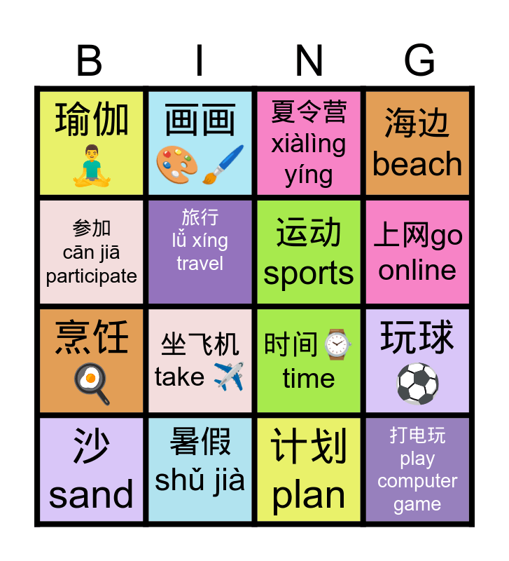 This bingo card has 16 words: 暑假 shǔ jià, 玩球 ⚽️, 夏令营 xiàlìng yíng, 瑜伽🧘♂️, 烹饪🍳, 画画 🎨🖌️, 时间⌚️ time, 计划plan, 参加 cān jiā participate, 旅行 lǚ xíng travel, 沙 sand, 海边 beach, 坐飞机 take ✈️, 上网go online, 运动 sports and 打电玩 play computer game.